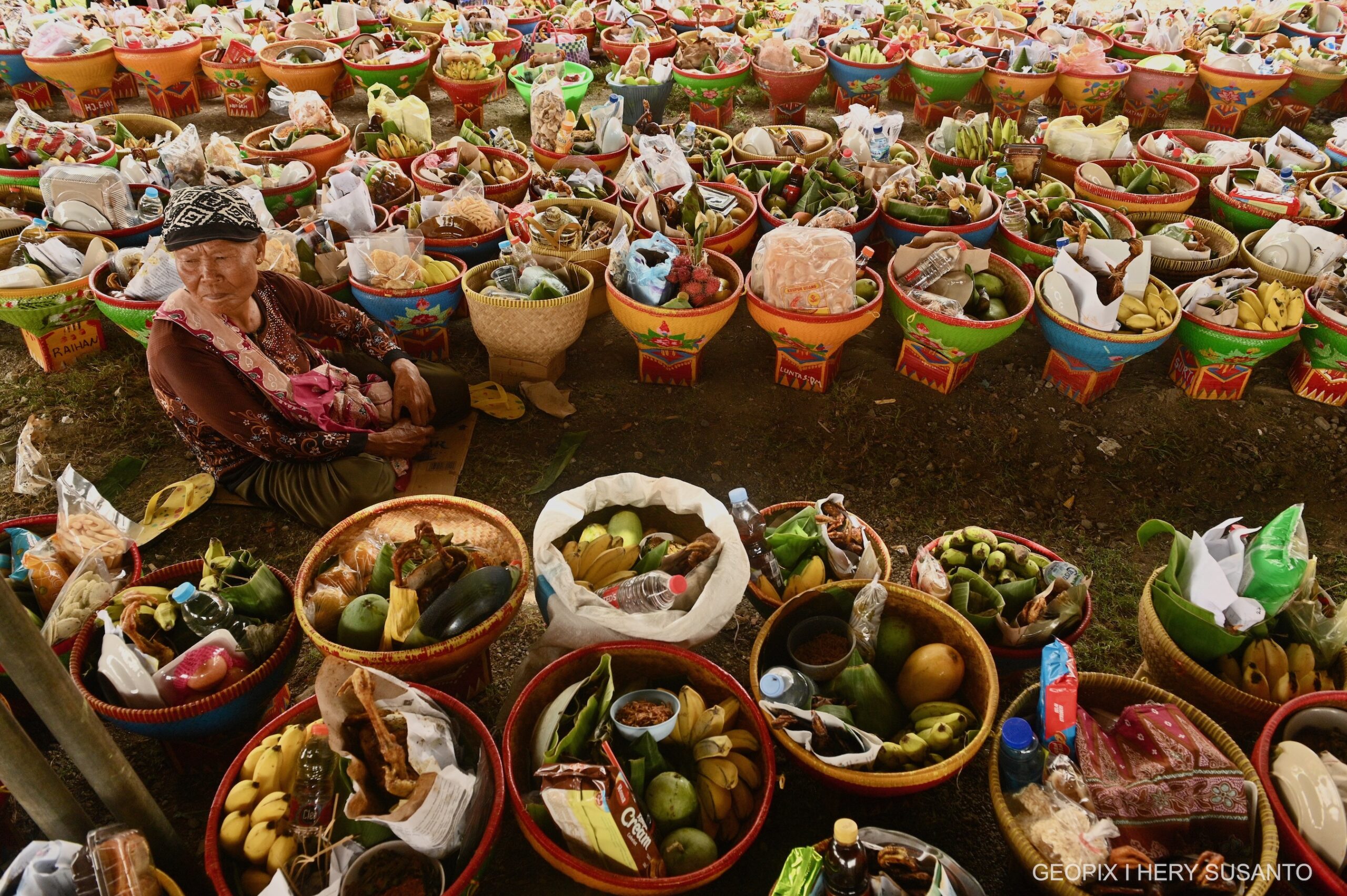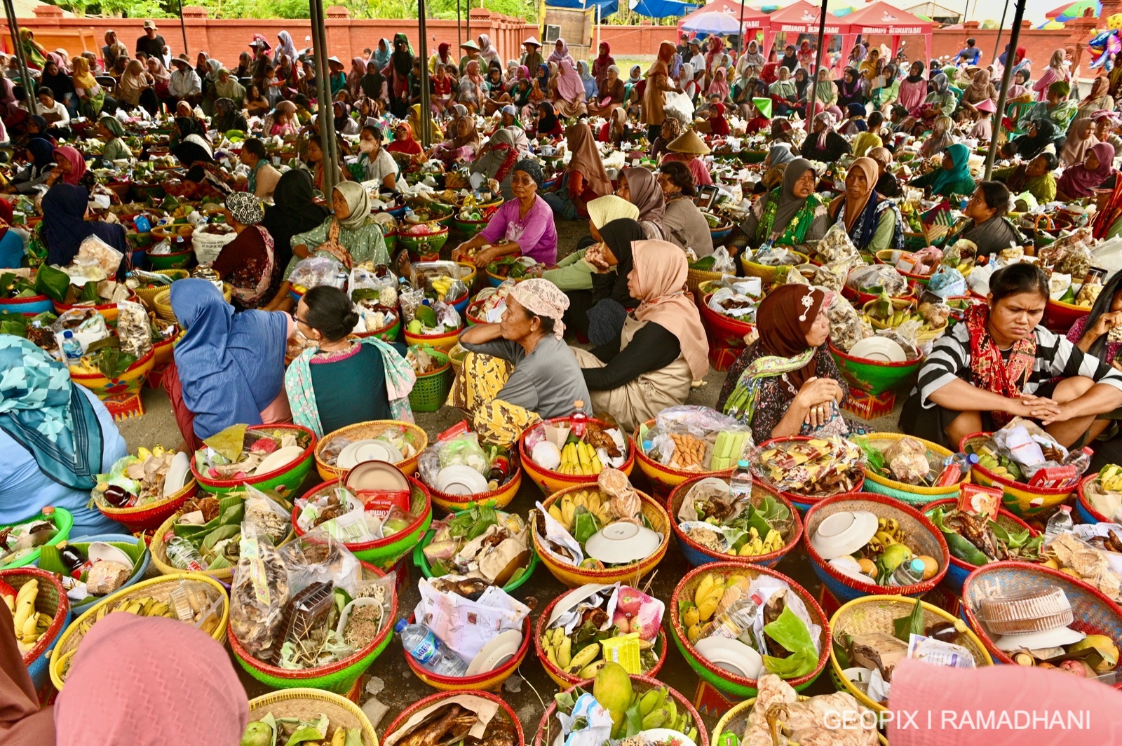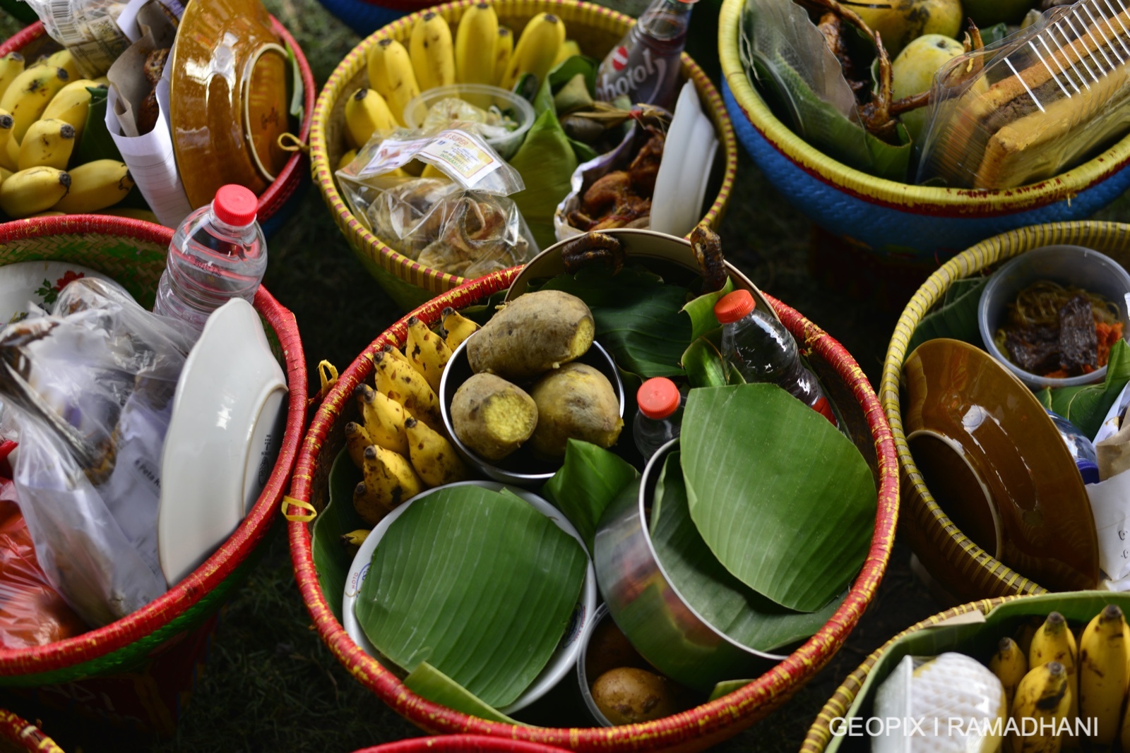 Setiap rumah akan membawa bakul berisi berbagai macam makanan seperti nasi tumpeng, ayam bakar, buah-buahan dan lain-lain yang akan dikumpulkan di pendopo desa untuk didoakan oleh tetua adat. Lalu setelah selesai makanan tersebut akan dimakan Bersama-sama anggota keluarga .
