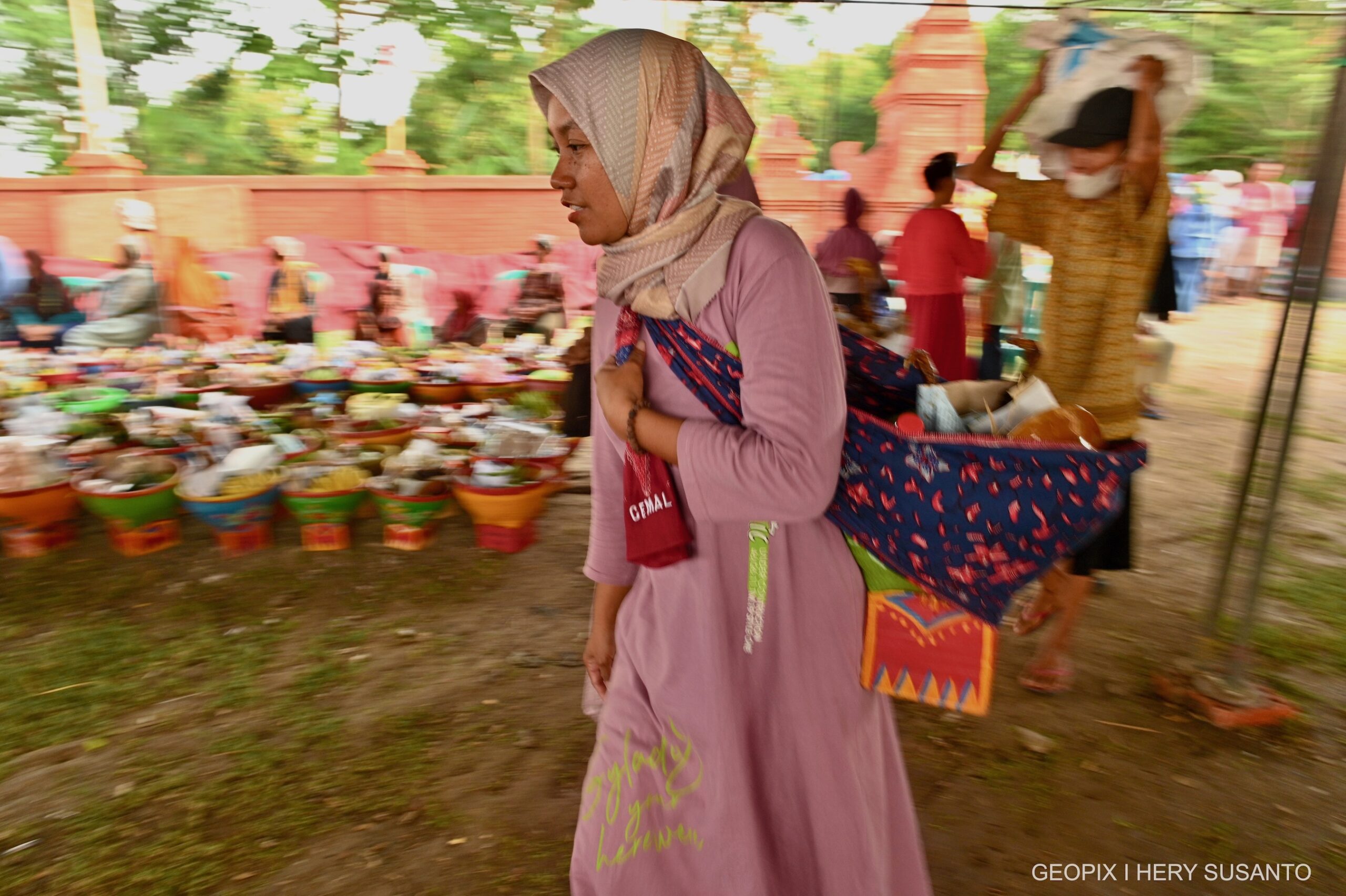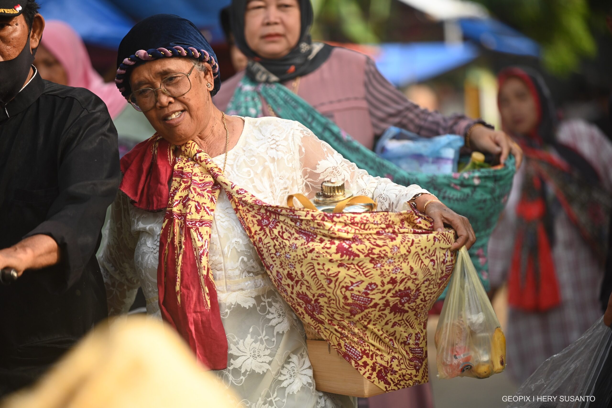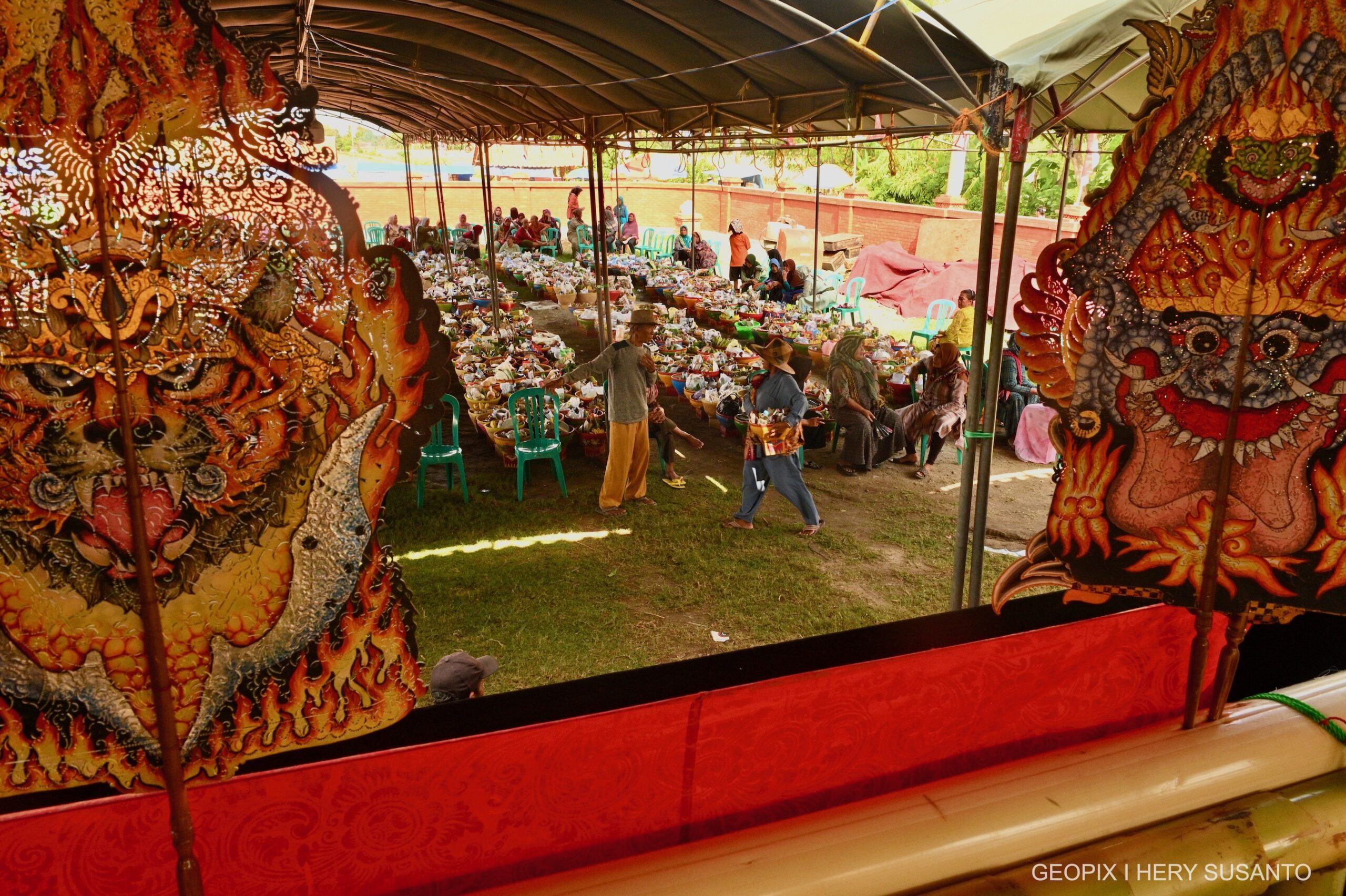 Setiap rumah akan membawa bakul berisi berbagai macam makanan seperti nasi tumpeng, ayam bakar, buah-buahan dan lain-lain yang akan dikumpulkan di pendopo desa untuk didoakan oleh tetua adat. Lalu setelah selesai makanan tersebut akan dimakan Bersama-sama anggota keluarga .